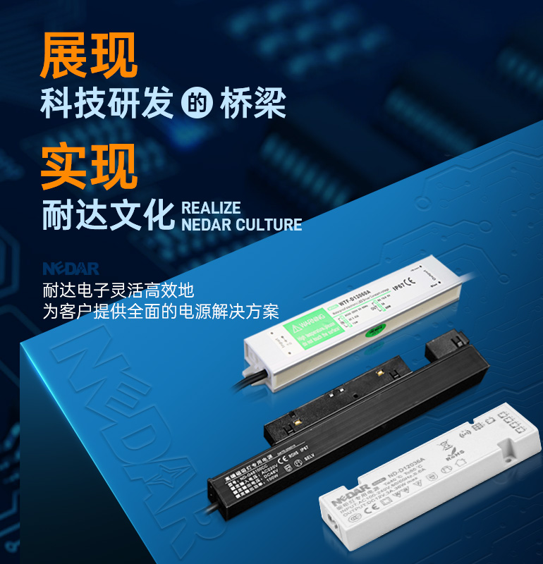 中山市耐達電子有限公司成立于2009年,是一家專業研發、生產、銷售LED磁吸軌道燈電源、鏡前燈電源、櫥柜燈電源、防水開關電源等智能家居電源的企業。公司位于有“中國小家電產業基地”之稱的——廣東省中山市東鳳鎮。公司產品遍及國內各省、市,并遠銷出口歐、美、東南亞等二十幾個國家。